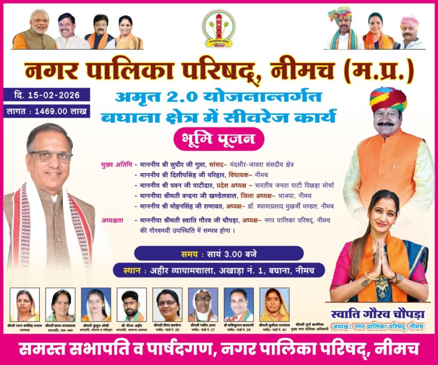 NMH NEWS नीमच। नगर पालिका परिषद द्वारा शहर के विकास की दिशा में एक और कदम उठाया जा रहा है। सालों से बदहाली का दंश झेल रहे उप नगर बघाना को अब गंदगी और सीवर की समस्या से मुक्ति मिलने वाली है। नपाध्यक्ष श्रीमती स्वाति गौरव चोपड़ा के मार्गदर्शन में अमृत 2.0 योजना के तहत उप नगर बघाना में 14 करोड़ 69 लाख रुपये की लागत से सीवरेज कार्य का भूमिपूजन आज रविवार को होगा। आज दोपहर 3 बजे अहीर व्यायामशाला (अखाड़ा नंबर 1) के पास एक कार्यक्रम आयोजित किया गया।